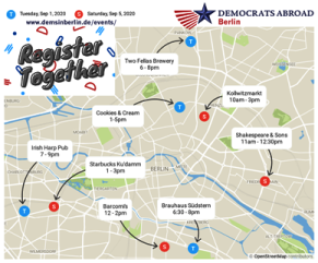 | Tuesday, Sept. 1 & Saturday Sept. 5, Democrats Abroad Germany - Berlin Chapter has 8 outdoor #registertogether locations around Berlin. | |
