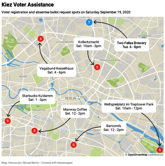 | Saturday, Sept. 19, Democrats Abroad Germany - Berlin Chapter has tons of opportunities to get voting help and connect with other Americans in your neighborhood: Prenzlauer Berg Kiez Voter Assistance – Democrats Abroad Berlin at Kollwitzmarkt, 10am - 3pm Dems Playground Meetup: Weltspielplatz in Treptower Park, 10am - 12pm Kreuzberg Kiez: Voter Assistance at Barcomi's, 12 - 2pm Schöneberg: Voter Assistance at Maxway Coffee, 12 - 2pm Charlottenburg Voter Assistance at Starbucks Ku'damm, 1 - 3pm Wedding: Voter Assistance at Vagabund Kessehlaus, 4-6pm. |