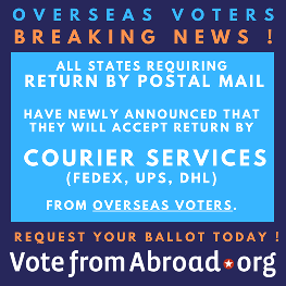 ![]() Information is also available directly from the U.S. government's Federal Voting Assistance Program. The official Federal Post Card Application can be downloaded there directly. |