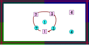 | 9-16 | 1st man casts back up, all the way around second couple to middle of dance, followed by 1st lady who stops between 2nd and 3rd men. | ![]() |
